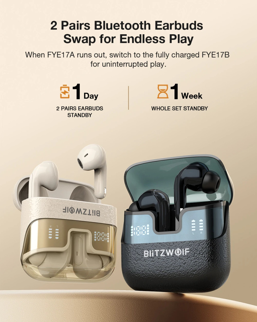 Der BlitzWolf® BW-FYE17 Bluetooth-Kopfhörer ist ein vielseitiger, komfortabler und hochwertiger kabelloser Kopfhörer, der sich ideal für den Alltag eignet – egal ob zum Telefonieren, Musikhören oder Sport. Die zwei Paar Ohrhörer, die doppelte LED-Anzeige am Ladecase, die lange Akkulaufzeit und das ergonomische, ultraleichte Design machen dieses Gerät zu Ihrem perfekten Begleiter im Alltag.