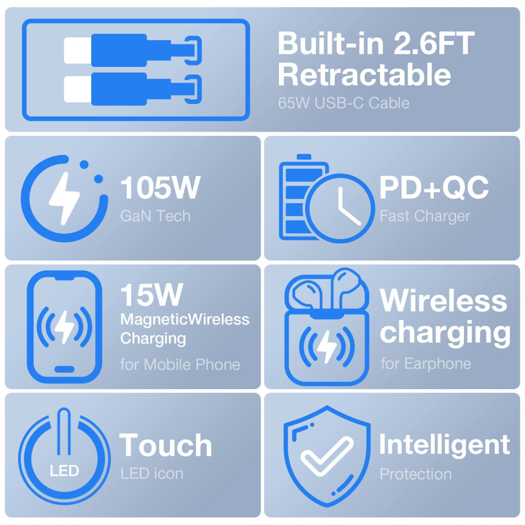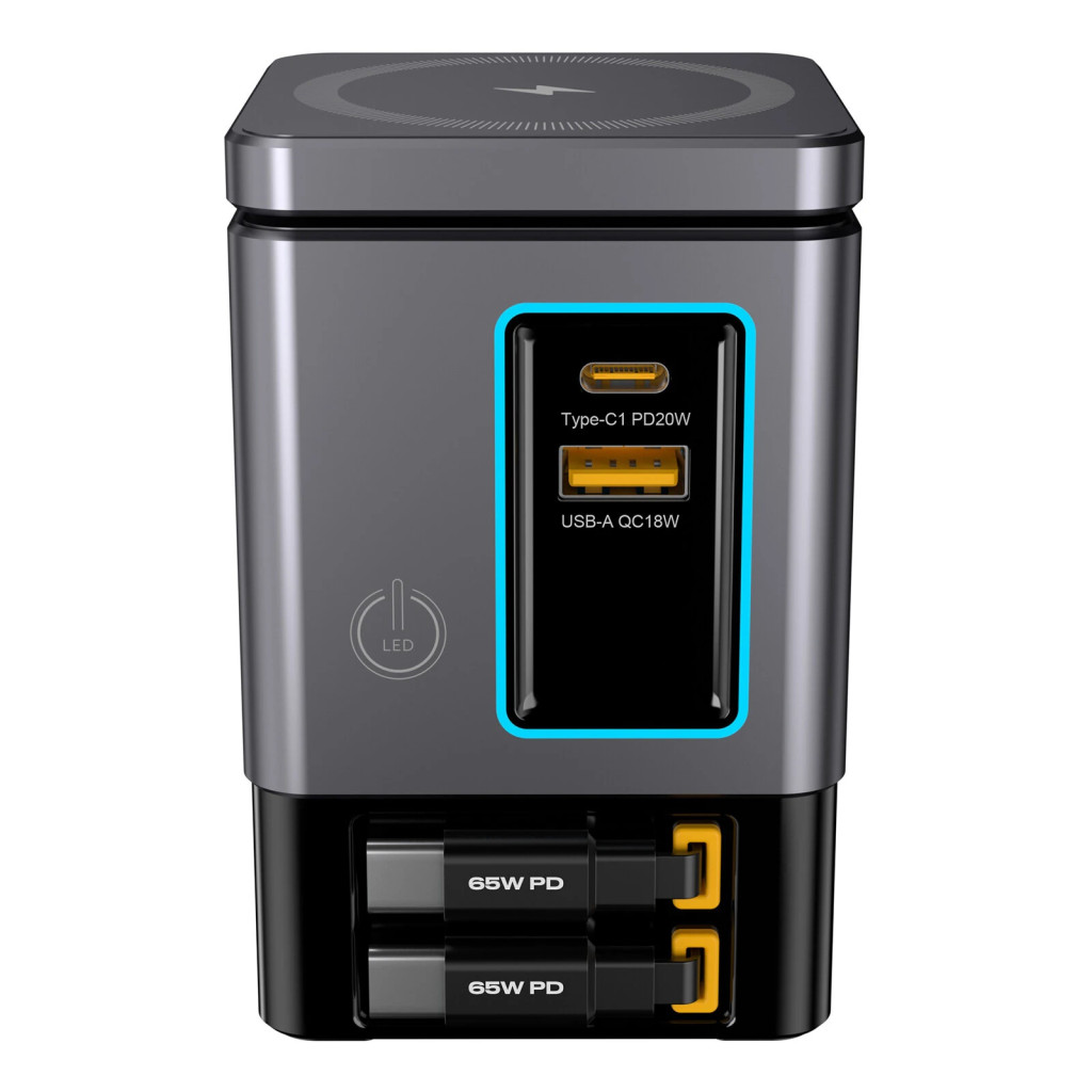 - Anschlüsse: 2x integriertes Teleskop-Type-C-Kabel, 1x USB-A Port, 1x USB-C Port, 2-in-1 kabellose Ladefläche.